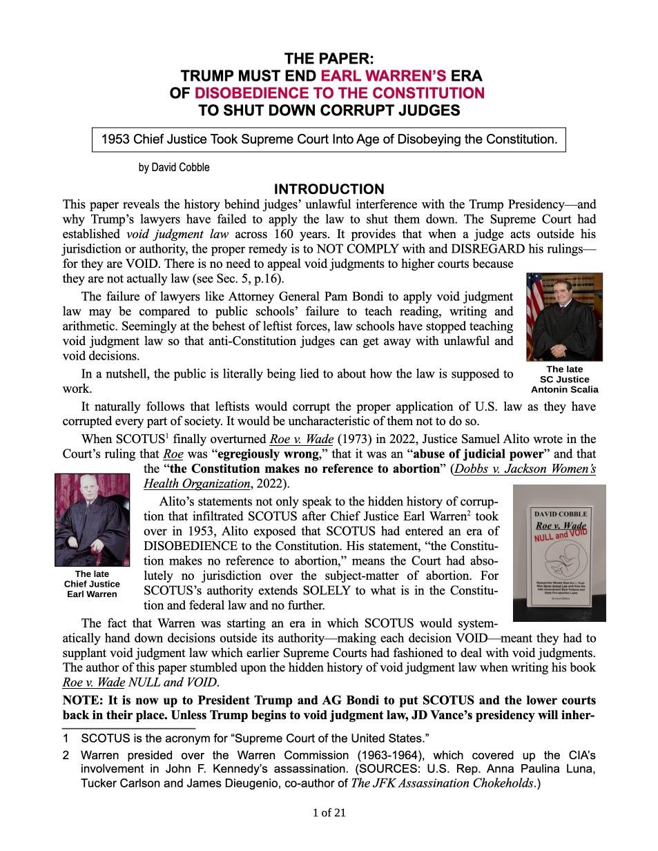 1. The name of this paper is “The Paper: Trump Must End Earl Warren’s Era of Disobedience to the Constitution to Shut Down Corrupt Judges” (21 pages)